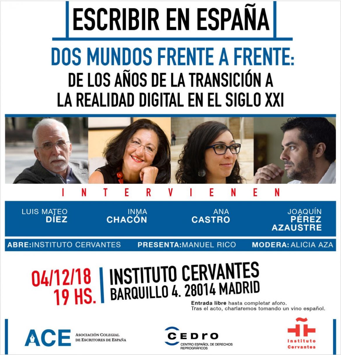 Estas son algunas preguntas que hoy todos nos hacemos. En el diálogo organizado el próximo día 4, ACE ha partido de un hecho: el escritor, hoy, se mueve en un mundo literario en el que conviven varias generaciones. Esencialmente, la generación que comenzó a publicar al hilo de la transición política, a finales de los 70/principios de los 80, formada íntegramente en el mundo del papel y productora de su obra sobre las bases heredadas de las generaciones anteriores; la que, nacida en los años 50 y sesenta, adquiere madurez literaria a finales del siglo XX y principios del siglo XXI; la de los nacidos en los años 70, que viven directamente el boom de lo digital aunque se forman en el mundo del papel y de lo analógico y los que son directamente «nativos» digitales. Con ligeros matices, esos mundos, esas realidades están representados en nuestro diálogo entre generaciones.