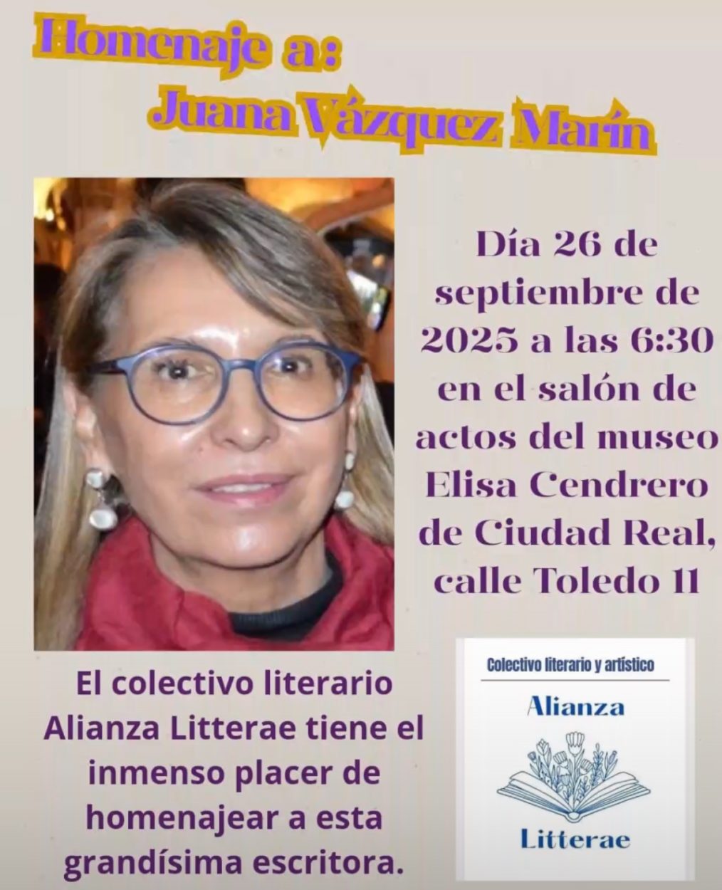 El Colectivo Literario Alianza Litterae organiza un homenaje a Juana Vázquez Marín, poeta y escritora.