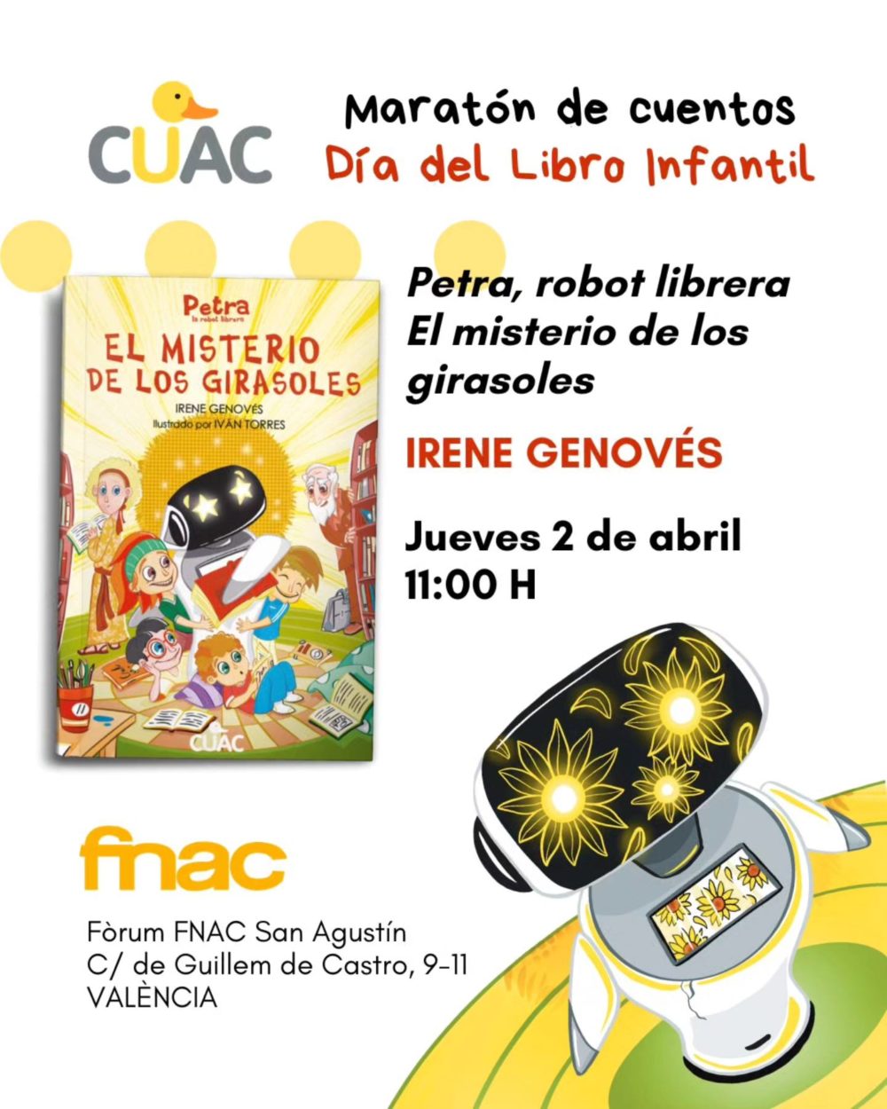 El jueves, 2 de abril, a las 11:00 horas, habrá un MARATÓN DE CUENTOS con motivo del Día del Libro Infantil donde participa Irene Genovés con su libro PETRA, ROBOT LIBRERA. EL MISTERIO DE LOS GIRASOLES (Cuac, 2025).