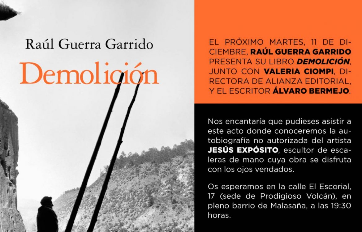 El próximo martes, 11 de diciembre, Raúl Guerra Garrido presenta su libro «Demolición«, junto con Valeria Ciompi, Directora de Alianza Editorial y el escritor Álvaro Bermejo