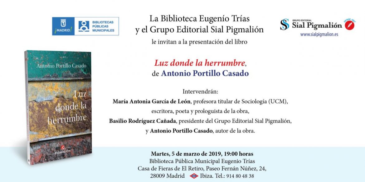 Antonio Portillo Casado presenta su último libro «Luz donde la herrumbre«. El acto está organizado por La biblioteca Eugenio Trías y el Grupo Editorial Sial Pigmaleón La presentación del libro tendrá lugar en:
